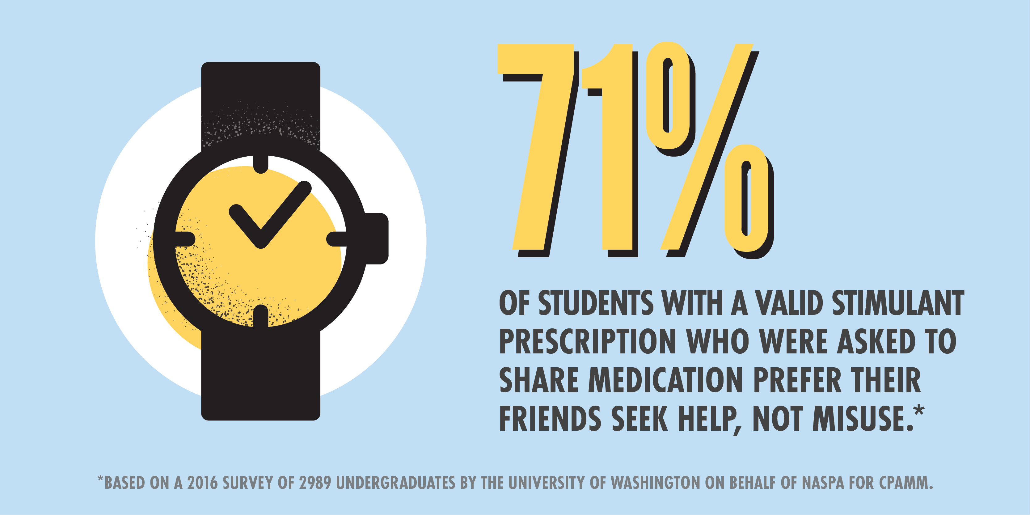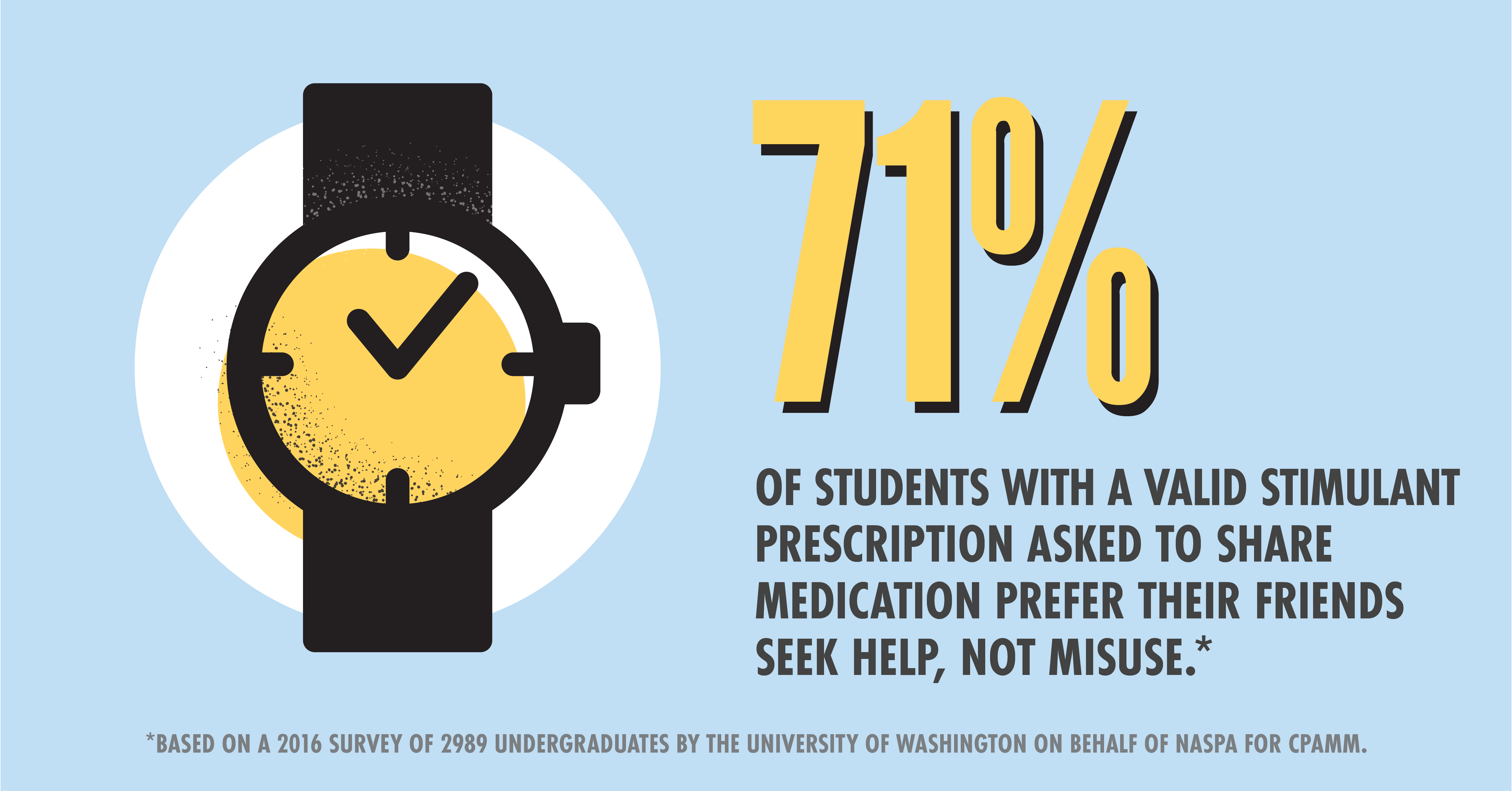 In 2017, CPAMM completed research to help inform messaging to the key target of college students. The resulting toolkit, which you can download below, highlights common misperceptions of prescription stimulant misuse and reinforces positive behavior using data-informed messaging. Through peer-to-peer acknowledgement that 84% of college students do not misuse, we can help undermine social norming of the issue.1